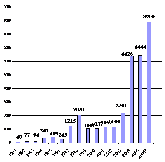 In Romania anului 2005, 104697 romani au primit vize de migrare pentru a munci in strainatate, 42758 au obtinut contract prin intermediul OMFM, iar 11210 si-au gasit locuri de munca in afara tarii apeland la agentiile de recrutare. Fluxul mediu anual de persoane care migreaza din Romania s-a stabilizat in jurul cifrei de 10000[5].