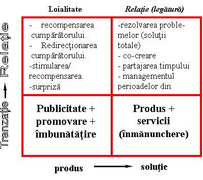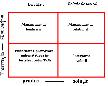 Exista distinctie particulara dintre loialitate si relatie in management. Managementul loialitatii este definit ca fiind o intelegere cu consumatorii tinta pentru a cumpara produsele firmei, returnandu-li-se acestora diverse recompense. Focalizarea comerciala este indreptata spre performanta produsului prin alegerea si recompensarea acelor consumatori care sunt cei mai profitabili pentru firma. Multe programe de loializare a consumatorilor sunt realizate prin prisma acestui obiectiv comercial. Managementul relatiei cu clientul/cumparatorul/consumatorul este legat de conducerea afacerii spre satisfacerea consumului prin crearea si furnizarea de solutii pentru consumatori, adesea prin extinderea valorii pe care companiile le realizeaza prin nivelul relatiilor existente. In unele industrii mature sau pe pietele unde opereaza multi competitori cu programe de loializare, managementul relational poate fi ultima optiune de a construi un avantaj competitional considerabil. Solutionarea cresterii valorii la consumator, in ansamblu, necesita adesea dispozitie si necesita in mod uzual schimburi multiple de informatii intre consumatori si furnizorii de valori. Programele create in domeniul managementului relational vor fi intotdeauna cea mai buna optiune strategica. Nici ele nu vor garanta in toate situatiile rezultate financiare mai bune. Nu exista alegere strategica perfecta pentru orice situatie. Pozitia strategica cea mai buna poate fi condusa in functie de produs, de categorie de produse, de piata, de canal sau chiar de (segmentul de) consumatori.