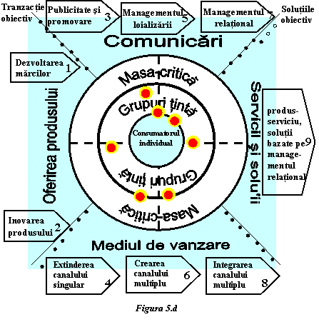 Figurile 5.a. si 5.b. prezinta aceasta extindere a domeniului strategic pornind de la cele doua directii comerciale: pe orizontala avem trecerea de la produse la solutii, iar pe verticala avem trecerea de la triviala tranzactie la conducerea afacerilor prin relatia directa cu consumatorul. Figura 5.a. indica faptul ca, in plus, se adauga la instrumentele traditionale de marketing cum ar fi: publicitatea si promovarea, perfectionarea legaturii dintre produs si punctul de vanzare (POS) prin micromarketing si merchandising la raft, inca trei noi sectoare de diferentiere. Figura 5.b. explica trecerea in aceste noi sectoare strategice, in mai multe detalii.
