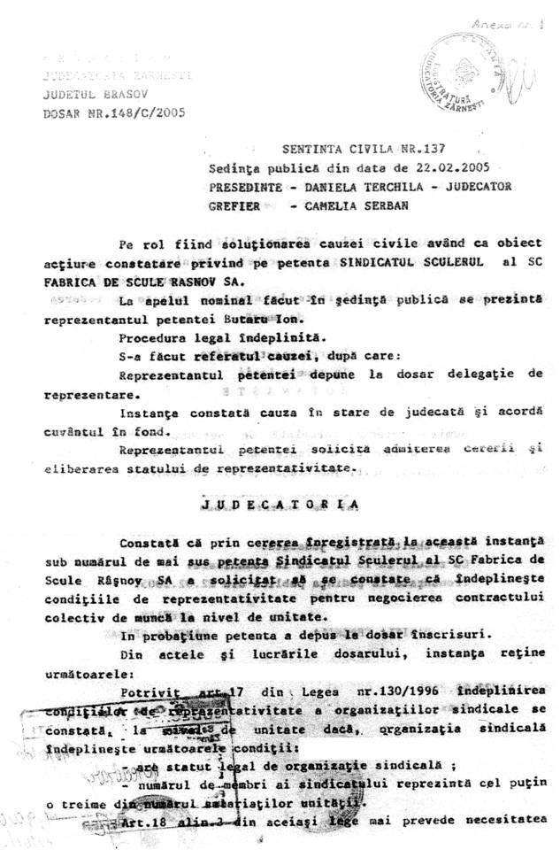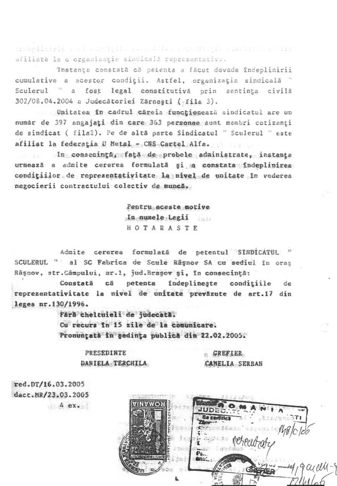 Salariata societatii sunt reprezentati de Sindicatul 'SCULERUL1', conform Sentintei Civile iar. 137, publicata in data de 22.02.2005 ( Anexa nr. 1).