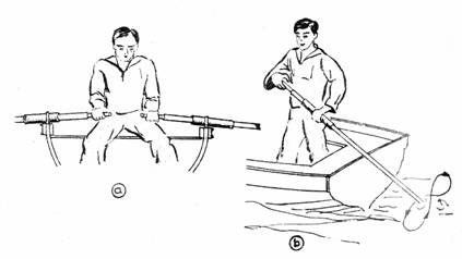 b) corpul se trage inapoi ridicand putin manerul, asa ca 2/3 din pana sa intre in apa. Corpul se lasa mult pe spate, iar cand a ajuns la limita cursei se strang si bratele cu o zvacnitura puternica. Trebuie mentionat ca numai aceasta ultima zvacnitura trebuie facuta din brate, restul ramarii facandu-se numai prin greutatea corpului. Aceasta pentru a nu obosi muschii bratelor si pentru a permite o ramare indelungata.