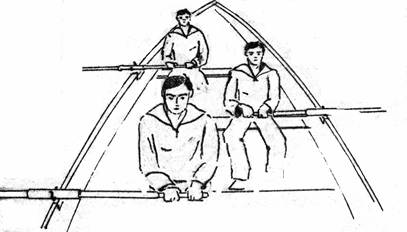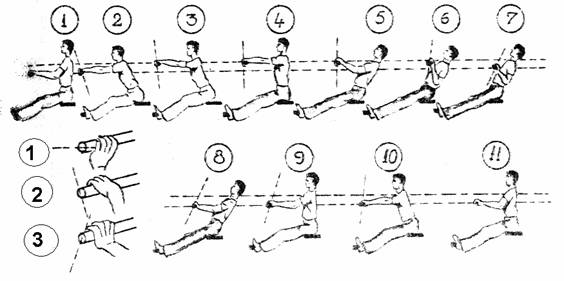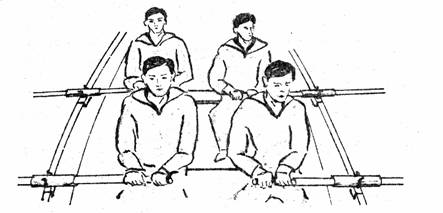(4) La ramarea inapoi, la timpul I se duce corpul inapoi, strangand bratele, la timpul II impinge corpul inainte, bagand rama in apa, iar la timpul III se revine la pozitia initiala.