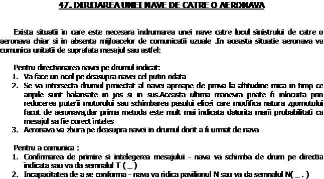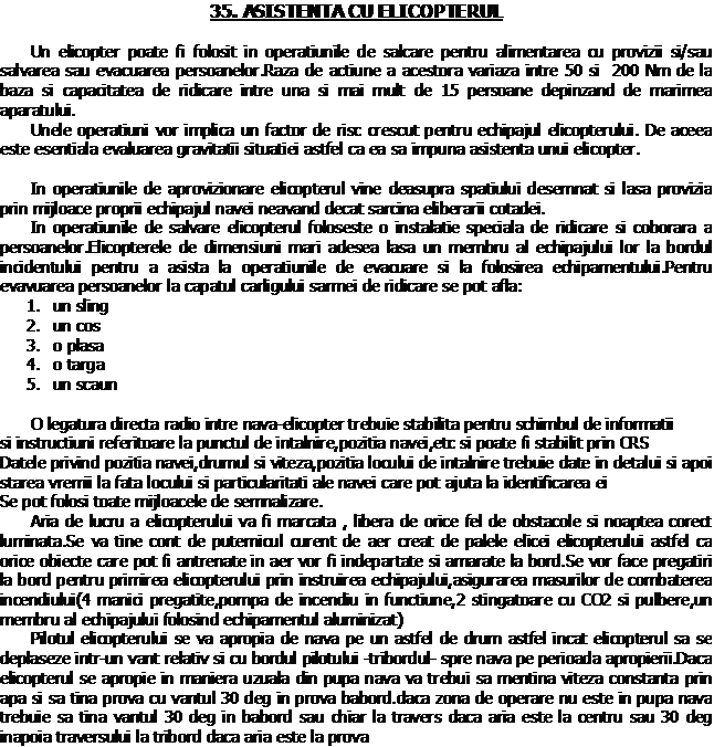 Daca pilotul vine cu elicopterul si acesta se apropie in maniera uzuala din pupa nava va trebui sa mentina viteza constanta prin apa si sa tina prova cu vantul 30 deg in prova babord.Daca zona de operare nu este in pupa nava trebuie sa tina vantul 30 deg in babord sau chiar la travers daca aria este la centru sau 30 deg inapoia traversului la tribord daca aria este la prova
