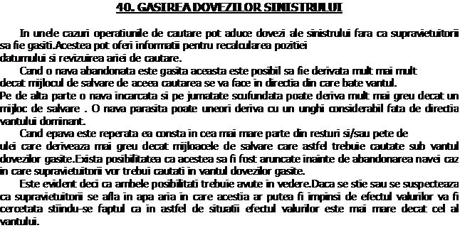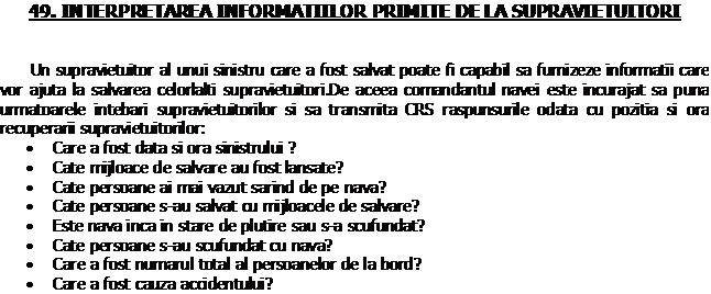 Supravietuitorii trebuie in masura posibilitatilor chestionati cu privire la nava sinistratasi daca au mai fost vazuti alti supravietuitori sau ambarcatiuni de salvare.Informatiile obtinute se transmit CSS