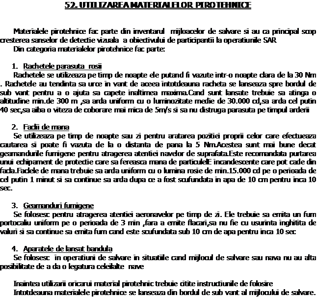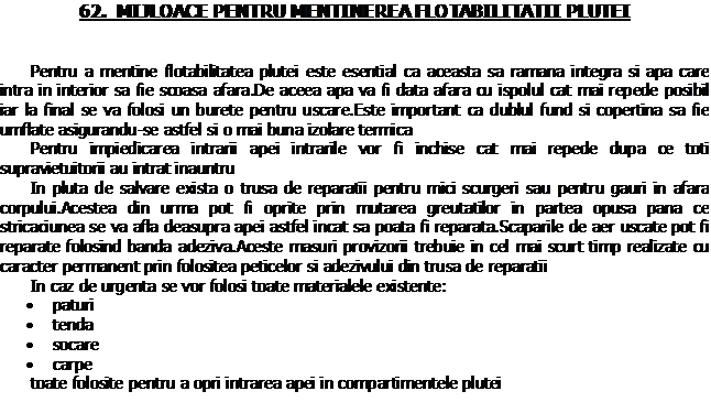 topoarele,uleiul de calmare a valurilor,ancora de furtuna si lampile sau lanternele pe timp de noapte nu trebuie niciodata debarcate.Tot echipamentul care nu este de imediata necesitate va fi stivuit pe fundul barcii de unde sa poata imediat fi luat si folosit.