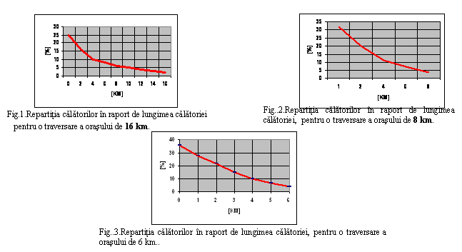 Aceasta constatare poate fi reprezentata grafic, in care pe axa absciselor se traseaza distantele parcurse de persoane sau calatori pe jos sau cu un vehicul, iar pe axa ordonatelor -numarul celor care se deplaseaza pe aceste distante (in procente din curentul total de persoane si curentul de trafic de calatori).-fig .1..2. si 3.