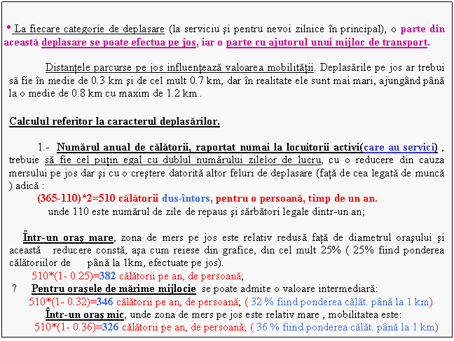 Valoarea m a mobilitatii se determina pe baza urmatoarelor consideratii: - fiecare locuitor efectueaza un anumit numar de calatorii (plecare de acasa si inapoiere acasa ); - fiecare calatorie (deplasare) se face pe o anumita distanta ( in functie de tip oras) |