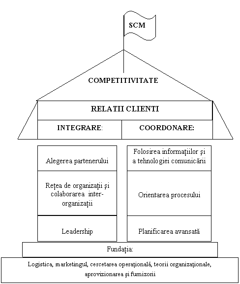 Acoperisul se sprijina pe doi stalpi care reprezinta cele 2 componente principale ale SCM si anume, integrarea unui ansamblu de organizatii si coordonarea informatiilor, materialelor si fluxurilor financiare. Figura arata, de asemenea, ca mai exista si alte discipline care isi au fundamentul in SCM.