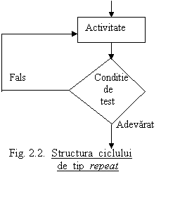 In cazul structurii while testarea conditiei de incheiere se face inaintea executarii corpului ciclului. A doua structura tip bucla, reprezentata in fig. 2.2., solicita sa se execute mai intai corpul ciclului si dupa aceea sa se testeze conditia de incheiere. Pentru reprezentarea schemei din fig. 2.2. in pseudocod se utilizeaza urmatoarea formulare :