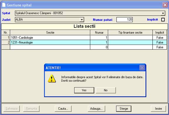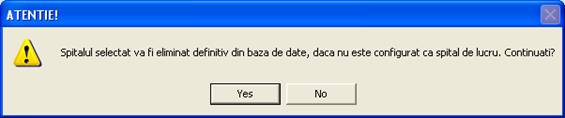 In cazul in care utilizatorul opereaza modificari asupra datelor, butoanele Salveaza si Renunta se activeaza, operatia de salvare a modificarilor avand loc numai daca utilizatorul salveaza aceste modifcari prin intermediul butonului Salveaza. In cazul stergerii unui spital, se solicita un mesaj suplimentar de confirmare din partea utilizatorului: