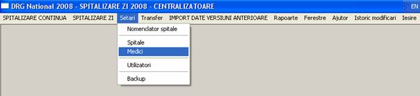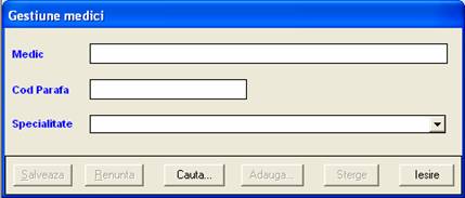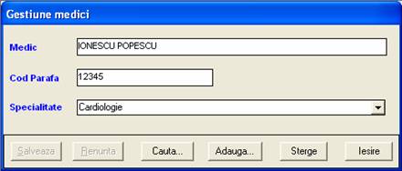 Din meniul aplicatiei se alege <<Setari/Medici>> si va apare macheta <<Gestiune medici>>. Operatia este permisa numai pentru utilizatorul "drgadmin".