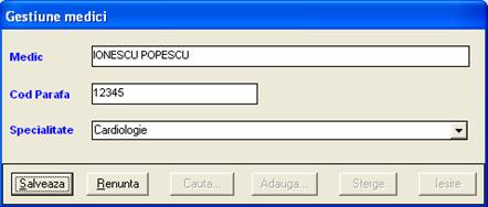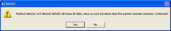 In cazul in care utilizatorul opereaza modificari asupra datelor, butoanele Salveaza si Renunta se activeaza, operatia de salvare a modificarilor avand loc numai daca utilizatorul salveaza aceste modifcari prin intermediul butonului Salveaza. In cazul stergerii unui medic, se solicita un mesaj suplimentar de confirmare din partea utilizatorului: