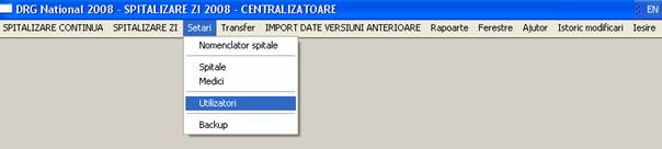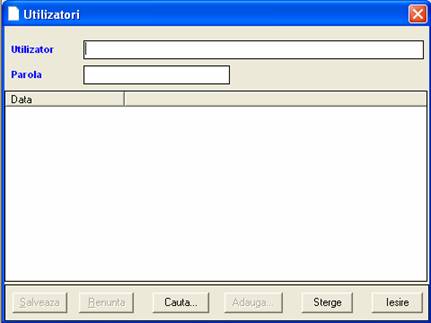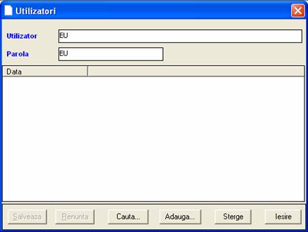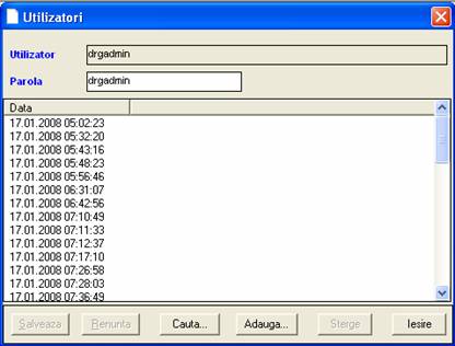 Din meniul aplicatiei se alege <<Setari/Utilizatori>> si va apare macheta <<Utilizatori>>. Operatia este permisa numai pentru utilizatorul "drgadmin".