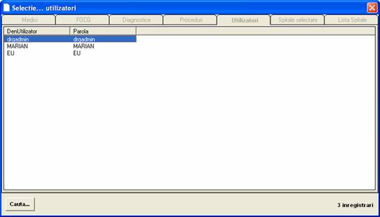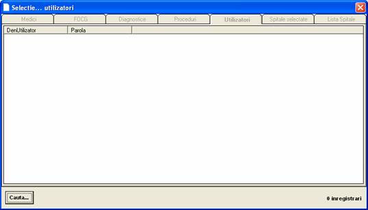 Pentru afisarea informatiilor disponibile in aceasta fereastra se utilizeaza butonul Cauta, stanga, jos, care va afisa informatii despre toti utilizatorii configurati pentru a utiliza aplicatia DRG National 2008: