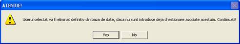 In cazul in care utilizatorul opereaza modificari asupra datelor, butoanele Salveaza si Renunta se activeaza, operatia de salvare a modificarilor avand loc numai daca utilizatorul salveaza aceste modificari prin intermediul butonului Salveaza. In cazul stergerii unui utilizator, se solicita un mesaj suplimentar de confirmare din partea utilizatorului: