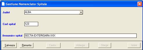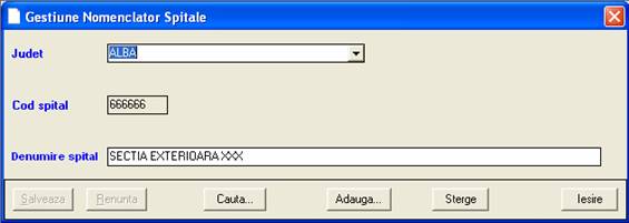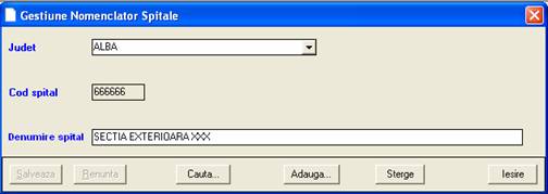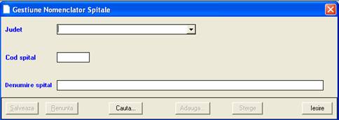Din meniul aplicatiei se alege <<Setari/Nomenclator spitale>> si va apare macheta <<Gestiune nomenclator spitale>>. Operatia este permisa numai pentru utilizatorul "drgadmin".