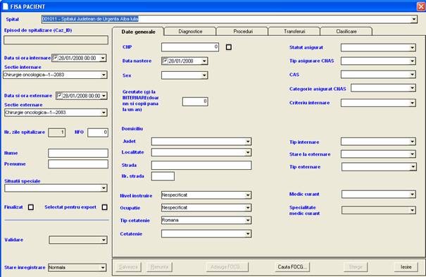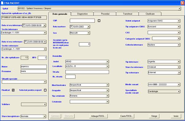 informatii specifice episodului de spitalizare, care se completeaza in partea stanga a interfetei si pacientului (sectiunea date generale:)