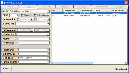 Pentru afisarea informatiilor disponibile in aceasta fereastra se utilizeaza butonul Cauta, stanga, jos, care va afisa informatii despre spitalele salvate anterior in baza de date a aplicatiei. De precizat ca se pot afisa toate spitalele, sau numai cele din judetul selectat in filtrul disponibil in partea stanga a machetei de selectie.