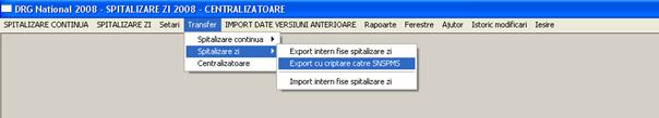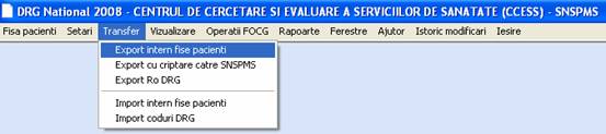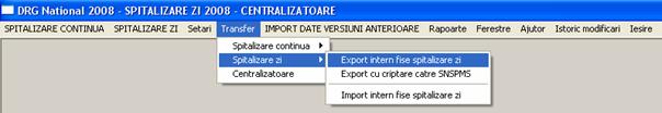 Aplicatia incepe prin a crea o copie a fisierului FisierExportIntern_Template.mdb, cu denumirea "FisierExportIntern_Versiunea1_ZZ.LL.AAAA_ZZ.LL.AAAA___DataCurenta.mdb", unde ZZ.LL.AAAA reprezinta intervalul in care se incadreaza foile de externare exportate. In prima etapa a acestui proces se copiaza urmatoarele nomenclatoare configurate local: ListaMedici, Lista_Sectii___Filtrat (contine sectiile setate local in baza de date utilizata curent), Lista_Spitale___Filtrat (contine spitalele setate local in baza de date utilizata curent). Daca operatia se finalizeaza cu succes, incepe exportul propriu zis al documentelor FSZ listate vizualizate in prealabil. Inainte de a detalia procedura de export propriu-zisa sunt necesare o serie de proceduri cu privire la nomenclatoarele transferate: