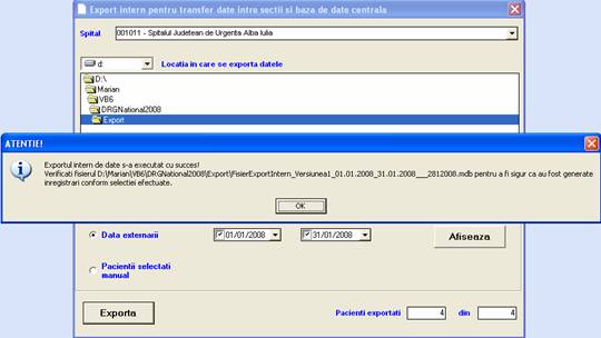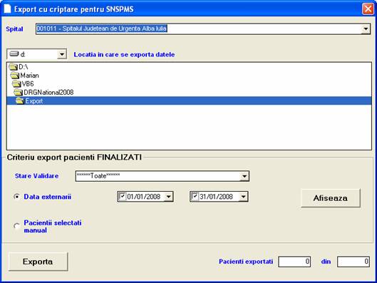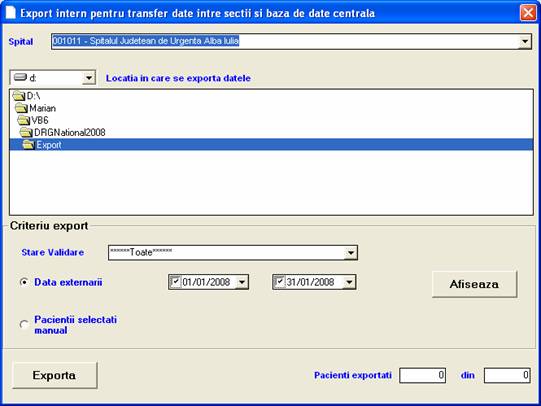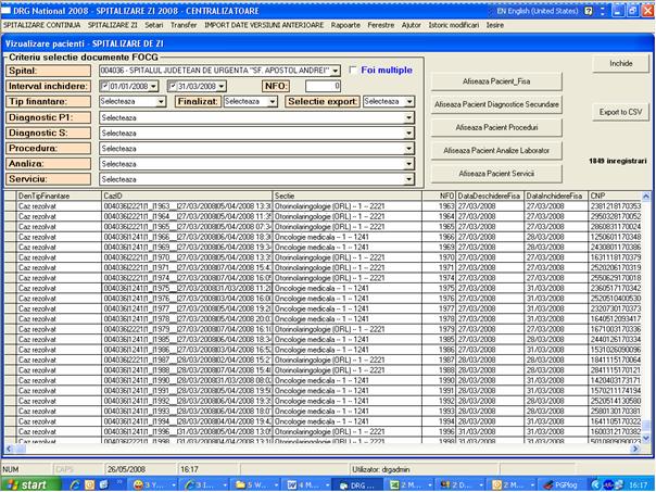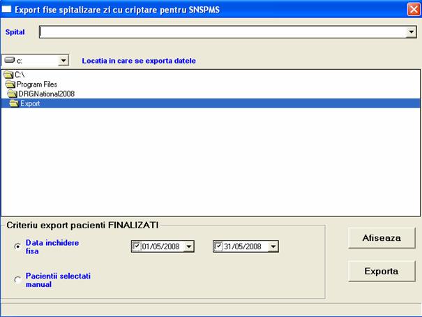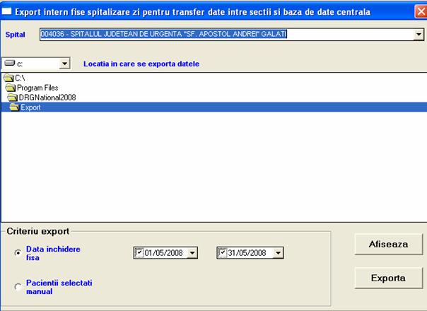 Vizualizare pacienti - permite definirea unui unui criteriu si afisarea informatiilor specifice acestui tip de spitalizare, cat si exportul datelor intr-un format compatibil Microsoft Excel. Datele listate sunt asociate tuturor tabelelor care stocheaza informatii specifice acestui tip de spitalizare.