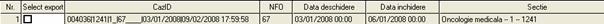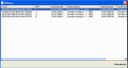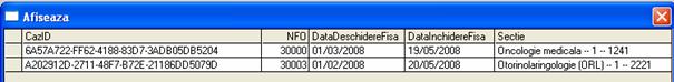 Butonul Afiseaza listeaza documentele FSZ care se vor exporta. In scopul accelerarii afisarii informatiilor, numai coloanele semnificative din documentul FSZ sunt afisate: CazID, NFO, DataDeschidereFisa, DataInchidereFisa, SectieExternare: