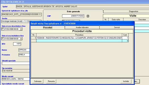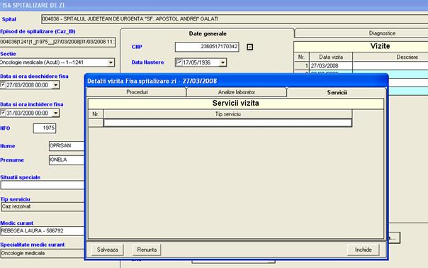 Fisa spitalizare zi - permite introducerea, editarea si stergerea informatiilor privind cazurile de spitalizare de zi, intr-un mod identic celui de la spitalizarea continua. In ceea ce priveste procedurile, serviciile, si analizele de laborator efectuate, acestea se colecteaza prin selectarea unei vizite si acesarea butonului Detalii Vizita.