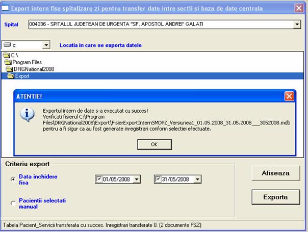 De remarcat ca in prtea dreapta jos a interfetei este afisat numarul pacientilor exportati. Daca cele doua cifre nu coincid este necesara consultarea fisierului "ExportFSZ_erori.txt" din directorul Log al aplicatiei.