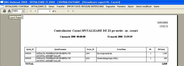Se pot rula rapoarte pentru uzul curent, la nivel de spital, in functie de diferiti indicatori. Toate rapoartele pot fi exportate in formate cunoscute, gen Excel, PDF etc, folosind meniul Rapoarte
