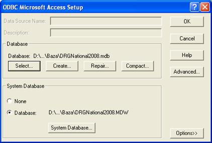 Prin intermediul butonul System database se alege fisierul DRGNational2008 .mdw ca fisier sistem