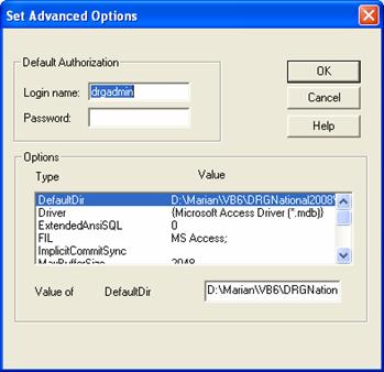 Se reconfigureaza fisierul DRGNational2008.dsn din catalgul baza de pe calculatoarele client urmand IDENTIC procedura descrisa in anexa 5.3, cu singura diferenta ca pentru variabilele Database si System Database se utilizeaza calea de retea Z, rezultata in urma operatiei Map Network Drive. Este de asemenea necesara autentificarea prin intermediul butonului Advanced.