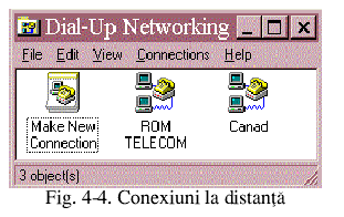 Din figura 4-4 se observa ca echipamentul de calcul dispune de doua conexiuni: Rom Telecom si Canad. Pentru a defini noi legaturi la distanta se utilizeaza aplicatia Make New Connection