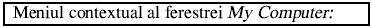 Exercitiu 4-5: Efectuati un click cu butonul din dreapta al mouse-ului in interiorul ferestrei My Computer avand grija sa nu pozitionati cursorul mouse-ului pe unul din obiectele afisate. Pe ecran va putea fi vizualizat meniul contextual al ferestrei, similar cu cel din figura de mai jos: