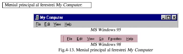 Optiunile acestui meniu pot fi selectate printr-un click cu butonul din stanga al mouse-lui sau utilizand tastatura, apasand simultan tastele ALT si litera subliniata din denumirea optiunii. Pentru ca utilizatorul sa aibe acces la facilitatile oferite de optiunile meniului, acesta trebuie in prealabil sa selecteze obiectul dorit din fereastra My Computer