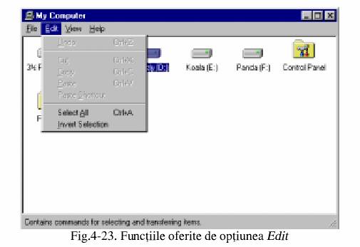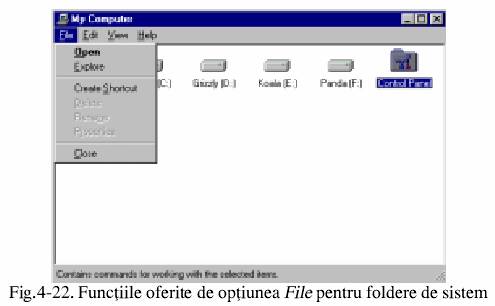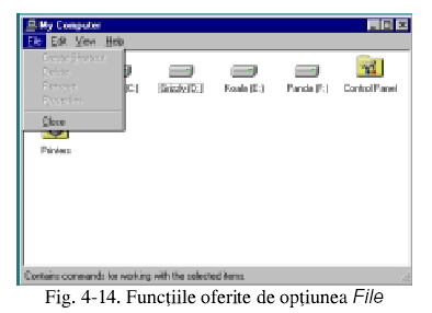 Exercitiu 4-8: Deschideti fereastra My Computer daca aceasta nu este deja deschisa si asigurati-va ca nici un obiect nu este selectat. Pentru a realiza acest lucru este suficient un singur click cu butonul din stanga al mouse-ului oriunde in interiorul ferestrei. Dupa aceea selectati optiunea File Observati ca nici una din suboptiunile afisate, exceptand una singura, nu este accesibila utilizatorului; utilizatorul poate selecta numai functia Close (vezi figura de mai jos).