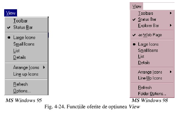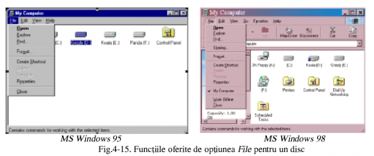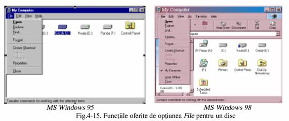 Exercitiu 4-9: Deschideti fereastra My Computer si selectati unitatea de disc C, dupa care selectati optiunea File Functiile de care dispune utilizatorul sunt similare cu cele din figura de mai jos. MS Windows 95 MS Windows 98