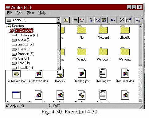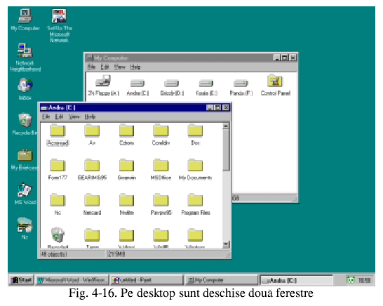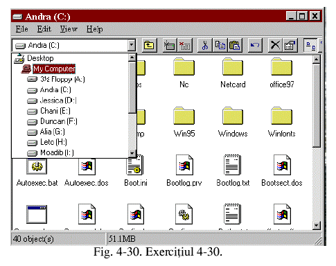 Exercitiu 5-52 (numai sub MS Windows 98): Din fereastra My Computer deschideti folderul pentru discul C (prin efectuarea unui dublu click pe icon-ul dsicului C). Pentru a reveni la fereastra My Computer, selectati optiunea Go Back din bara de meniu.