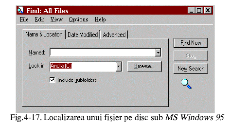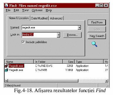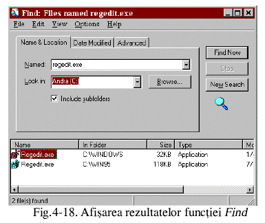 Pe pagina intitulata Name & Location, in dreptul etichetei Named vom introduce numele fisierului pe care-l cautam - Regedit.exe. Ne asiguram ca optiunea Include subfolders este selectata; aceasta optiune determina cautarea nu numai in folderele care sunt stocate pe discul C, dar si in cadrul tuturor subfolderelor acestora. Cu mouse-ul se efectueaza click pe butonul Find Now In urma functiei de cautare pe ecran vor fi afisate toate caile de acces catre fisierul dorit. Din figura de mai jos se poate observa ca fisierul respectiv a fost gasit in folderele C: WINDOWS si C: WIN95. Sunt afisate si alte informatii ajutatoare despre fisierul