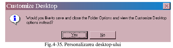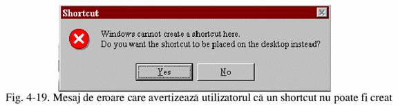 Prin fereastra dialog de mai sus sunteti atentionat ca nu puteti crea un shortcut catre obiectul respectiv in fereastra My Computer Vi se propune crearea shortcut-ului pe desktop. Daca aceasta varianta va multumeste atunci apasati butonul Yes; altfel, apasati butonul No