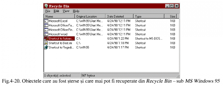 Exercitiu 4-15: Selectati obiectul cu denumirea Shortcut to Autoexec.bat si stergeti-l. Inchideti fereastra pentru discul C si deschideti aplicatia Recycle Bin al carei icon se afla pe desktop. Veti vedea ca obiectul pe care l-ati st-ers apare in lista de obiecte aruncate la cosul de gunoi: