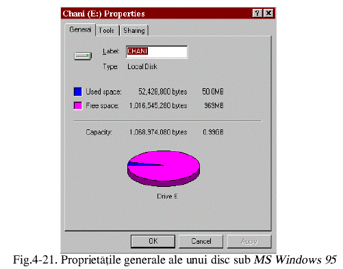 Properties: afiseaza fereastra cu proprietatile discului respectiv. Sub MS Windows 95, sunt disponibile trei pagini de configurare: General Tools s i Sharing (vezi figura 4-21). Sub MS Windows 98 mai este disponibila o pagina intitulata Compression, despre care se va discuta mai pe larg in urmatorul capitol; in cadrul acestei pagini, poate fi efectuata o compresie pentru datele stocate pe disc, astfel punand la dispozitia utilizatorului mai mult spatiu liber pe disc.