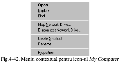 Daca se efectueaza click cu butonul din dreapta al mouse-ului pe icon-ul My Computer de pe desktop atunci va fi afisat urmatorul meniu contextual: