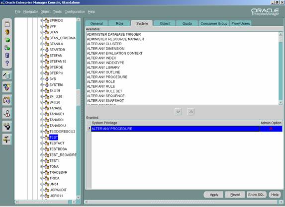 In figura 1 se granteaza utilizatorului TEST privilegiul ALTER ANY PROCEDURE.