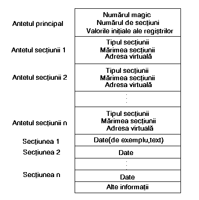 Figura 8.20 prezinta formatul logic al unui fisier executabil, asa cum exista in sistemul de fisiere, generat de obicei de asamblor sau incarcator. Acesta contine 4 parti: