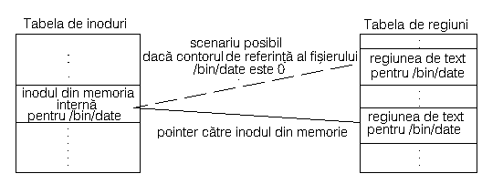 Daca un proces executa un apel unlink pentru fisier, nici un proces nu va mai putea sa-l execute in continuare pentru ca fisierul nu mai are intrare in sistemul de fisiere; din acest motiv nici un proces nou nu va accesa intrarea fisierului din tabela de regiuni. Pentru ca nu este nevoie de regiunea de cod, nucleul o poate sterge pentru a elibera unele resurse.