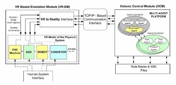 Mediul de operare este constituit din doua mari module: modulul de emulare bazat pe VR (VR-EM), care trebuie sa emuleze comportamentul sistemului fizic de fabricatie, fiind controlat prin intermediul modelului VR; si un modul de control holonic (HCM), utilizat pentru a implementa arhitecturile de control holonice in mediul JAVA-JADE. Structura mediului de operare este aratata in figura de mai jos.
