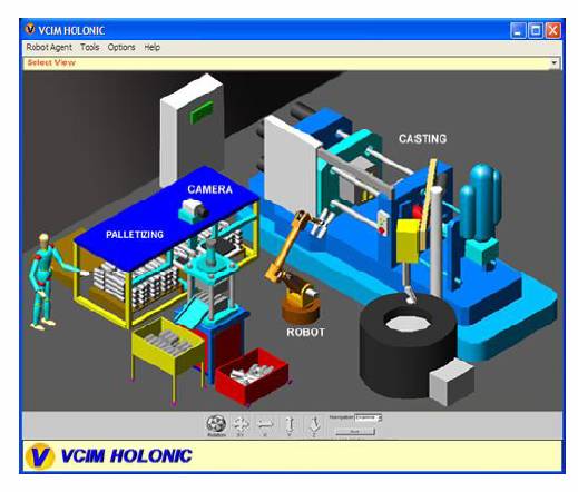 Consortiul HMS a dezvoltat o unealta interactiva, pentru a simula vizual fluxul material holonic. Programul urmareste activitatea dintr-un atelier de productie automatizat, unde fluxul material este transportat de autovehicule ghidate automat (AGV). Ca rezultat al efortului de cercetare in cadrul IMS (Intelligent Manufacturing Systems), compania Rockwell Automation in colaborare cu alti parteneri a proiectat si dezvoltat MAST (Manufacturing Agent Simulation Tool), o unealta de vizualizare grafica pentru sisteme multi agent.