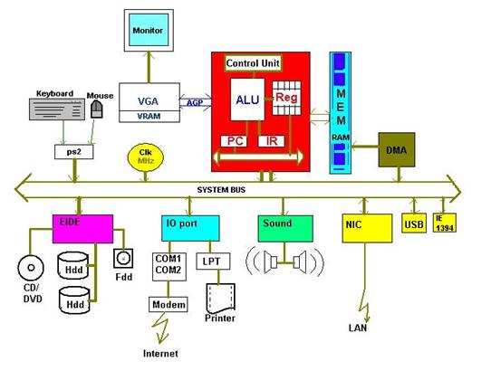 Se poate observa, ca sistemul este construit pe baza unei magistrale de sistem (System Bus), ce leaga diferitele componente. Pe aceasta magistrala sunt transferate datele, comenzile si adresele necesare functionarii sistemului. Functionarea sincrona este asigurata de un generator de frecvente (Clk), care da tactul de baza. Diferitele componente functioneaza sincronizate pe multiplii din aceasta frecventa de baza. Programele aflate in executie si datele corespunzatoare sunt stocate in memoria interna (memoria RAM), de unde sunt predate in ordine spre executare pentru microprocesor. Microprocesorul asigura executarea operatiilor de baza (unitatea aritmetica si logica ALU) pe baza codurilor citite din memorie si stocate in registrul de instructiuni (IR). Parcurgerea secventiala a programelor este asigurata de registrul contor de program(PC). Legatura dintre microprocesor si memoria interna este asigurata de o magistrala speciala de mare viteza, prin care se transfera simultan mai multe cuvinte(de ex. 128 biti in paralel, la frecventa de 800Mhz). Se pot transfera date in memoria interna direct de la periferice, ocolind microprocesorul prin unitatea de acces direct la memorie (DMA), procedeu folosit la periferice ce au nevoie de un transfer masiv de date (de exemplu hard discuri, placa de sunet). Legatura cu unitatea de afisare se face de asemenea pe o magistrala specializata (AGP), prin care se scriu in memoria placii video (VGA) informatiile ce trebuie afisate. Sistemul primeste comenzi de le perifericele de intrare (de obicei tastatura si mouse-ul, dar se poate folosi si joystick sau tableta grafica), care se leaga prin poarta ps2. Stocarea datelor se realizeaza pe suport magnetic. Discurile magnetice si unitatile de CDROM sau DVD se leaga prin portul EIDE ce permite legarea a patru asemenea echipamente. Pe aceste unitati sunt stocate programele si datele ce urmeaza a fi utilizate, precum si rezultatele executarii programelor. Programele aflate in executie sunt incarcate de pe aceste discuri in memoria interna (RAM)- memorie ce isi pierde continutul la oprirea calculatorului. Legatura cu perifericele externe sunt realizate prin porturile seriale (COM1, COM2) si prin porturile paralele (LPT1). Pe aceste porturi se leaga modemuri (porturi seriale) sau imprimante sa scanere (porturi paralele). La sistemele mai noi gasim si alte porturi, mai rapide , cum ar fi portul USB, care permite legarea echipamentelor rapide cum ar fi camere digitale, scanere, unitati de memorie externe (PEN drive), sau portul IE1394- destinat pentru transferul formatelor video digital. Legatura cu alte microcalculatoare sau servere se realizeaza prin placa de retea (NIC), ce ofera o viteza de comunicatie de ordinul 100 Mbps-1Gbps. Pentru a putea folosi aceste componente periferice trebuie sa dispunem de programele de control specifice(drivere), ce se integreaza in sistemul de operare (instalare).