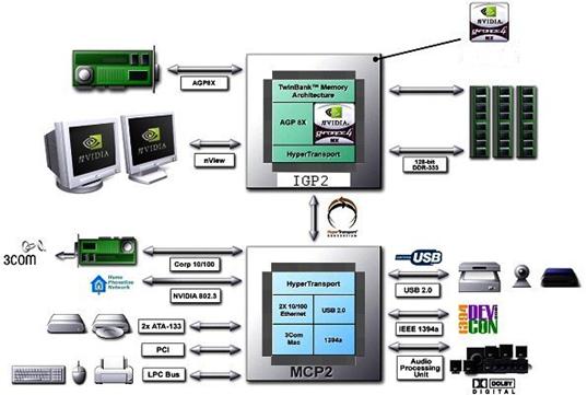 Pe aceasta imagine se poate distinge comanda magistralelor rapide realizata de unitatea notata cu IGP2, care leaga busul de memorie si busul AGP (northbridge), precum si magistralele mai lente, destinate perifericelor cum ar fi driverele EIDE de tip ATA133, busul PCI, porturile USB si IE1394 (southbridge). In acest chipset mai sunt integrate si functii de LAN si de sunet.