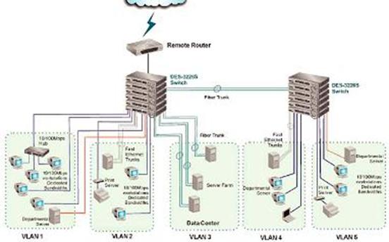 In figura alaturata se prezinta un caz concret de realizare a unui LAN cu topologie ierarhica stelara si cu legaturi la Internet pe linii dedicate prin intermediul unui router.