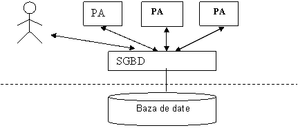 Intr-o viziune simplificata un sistem informatic cu baze de date poate fi vazut ca un ansamblu de programe de aplicatie care, prin intermediul unui software specializat pentru gestiunea centralizata a bazei de date (un SGBD generalizat sau un alt produs software realizat pe masura) actioneaza asupra datelor stocate in baza de date (figura 7.6). In plus pot exista o serie de utilizatori on-line care lucreaza direct cu baza de date sau prin intermediul unor programe de aplicatii.